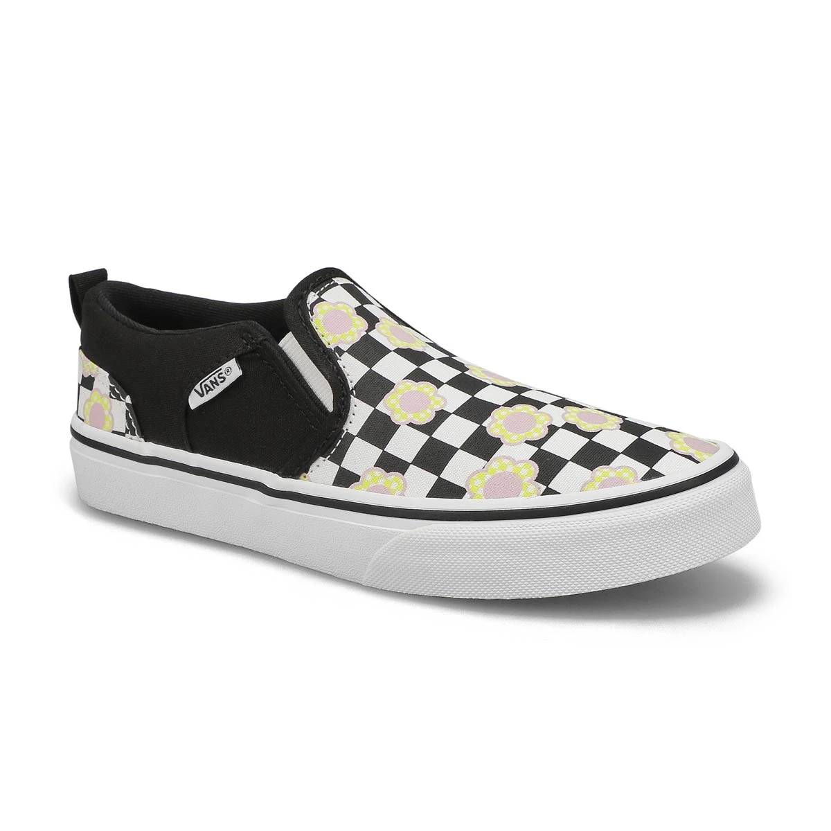 Dress yourself in a classic skate style with the red Asher Flower Checkboard slip on sneakers from Vans. Featuring a durable canvas upper with a low profile skate shoe design. Slip-on construction with elastic goring makes for any easy on/off comfort and style. The Asher slip on style from Vans comes with their signature waffle pattern on rubber outsole.